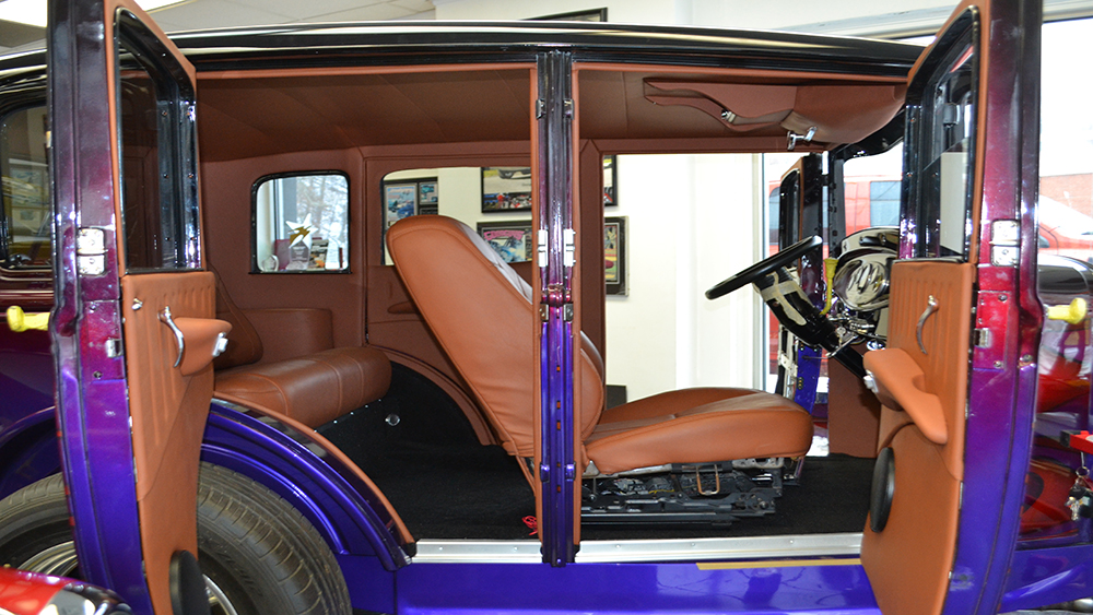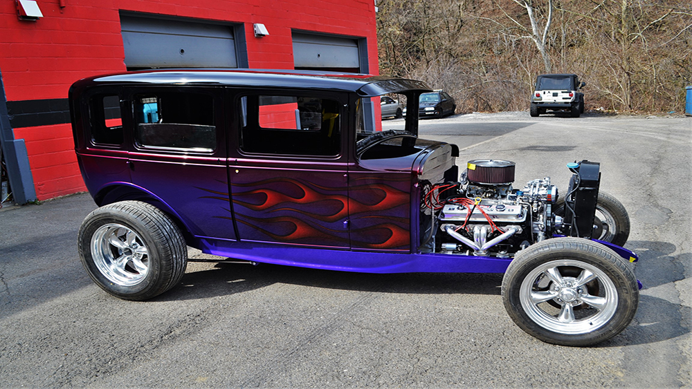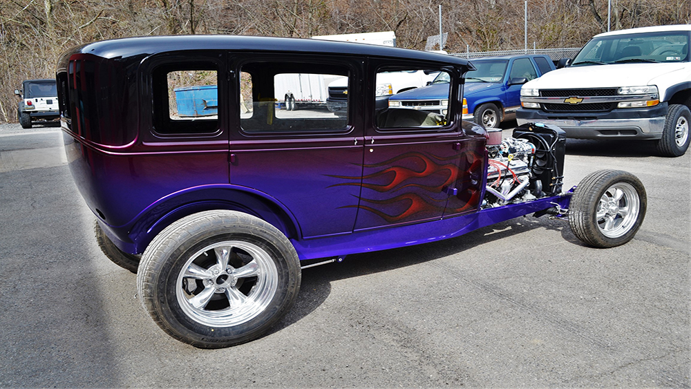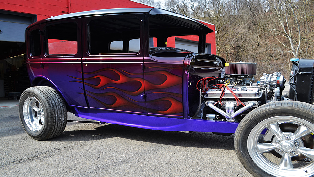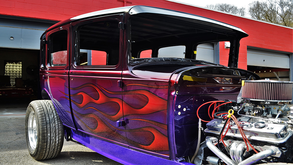 This sedan was a team effort. The great quality frame and body for this classic 1931 Ford is from Brookville Roadster and the metal work was done by Ron’s Rods in Kingsville, MD. Pro Comp Custom did the bodywork, paint, and mechanical. The paint is beautiful — The main part of the body has a variety of underbases and the House of Kolor Kandy tints are brandywine and two different shades of violet. The flames are tangerine. The colors flow together seamlessly.