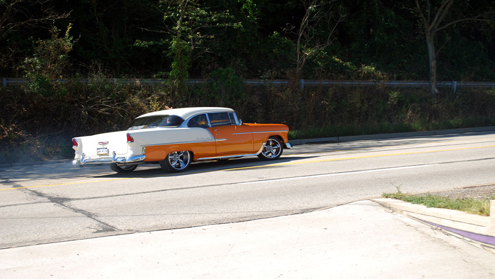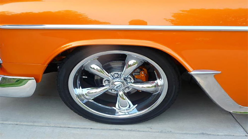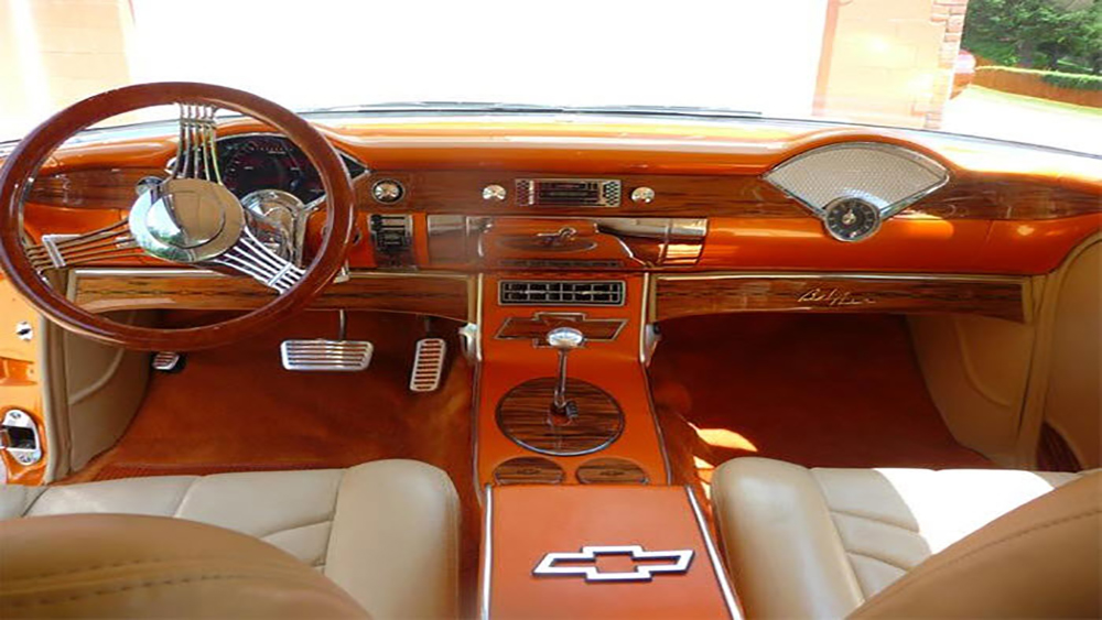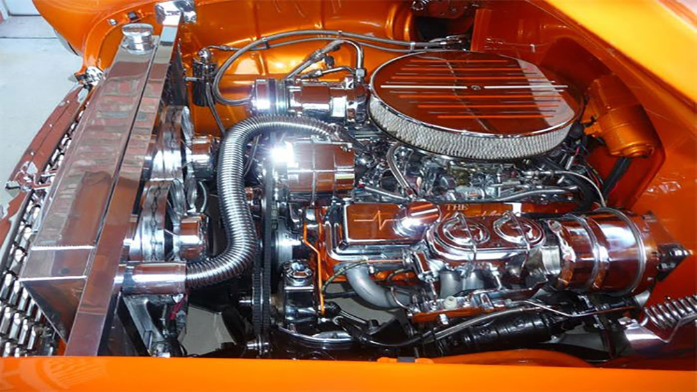 The Dupont tango effect orange draws people right to it. It has a 350 cubic inch, camelback heads, GM turbo 350 transmission, power steering, 4-wheel power disc brakes, chrome wheels 20x10 rear and 18x8 front, AC with Be Cool radiator and condenser, jet hot-coated headers, smooth firewall, dual chrome electric fans, engine compartment highly detailed in chrome, stainless hood hinges, front of frame filled and smoothed in black metal flake, 2” dropped spindles, rear suspension lowered, stainless exhaust. It also has a custom interior with bucket seats and console, polished lokar pedals, polished column, lokar shifter, Dakota digital dash, chrome door hinges, custom door handles and cranks with wood grain inserts, wood grain trim throughout interior, custom steering wheel in wood and chrome, headliner sculpted, smoke glass, custom finished trunk compartment with storage, smooth one-piece front bumper.