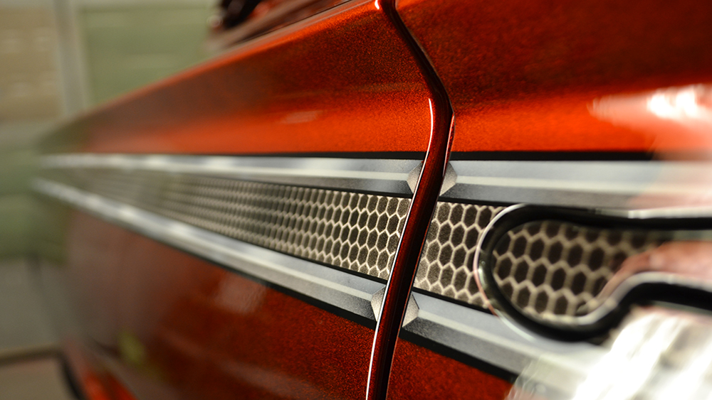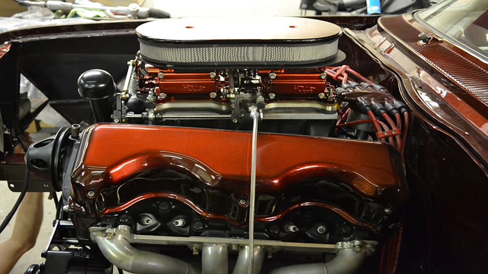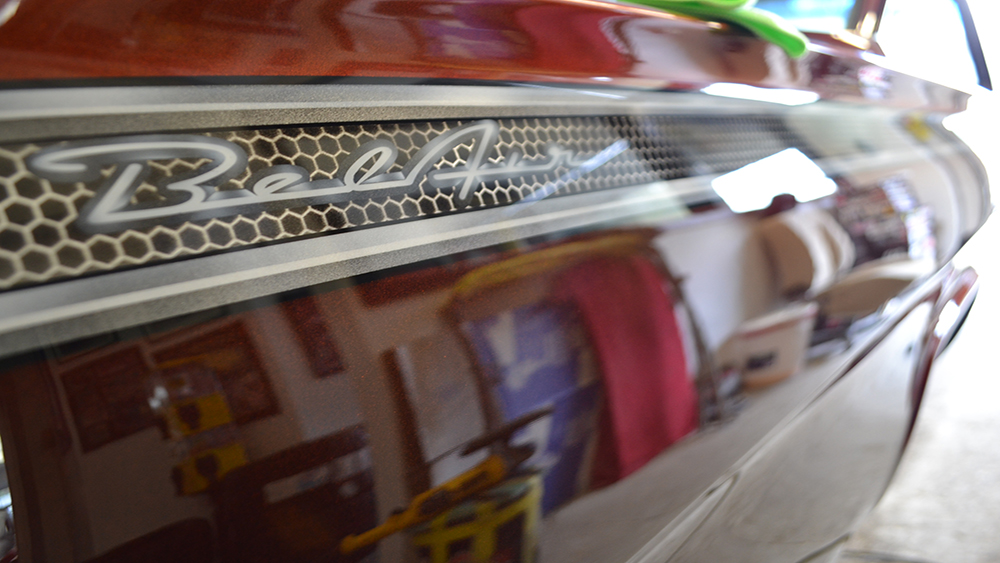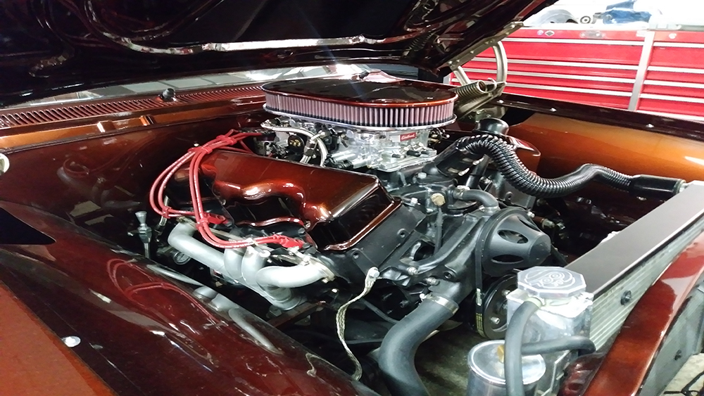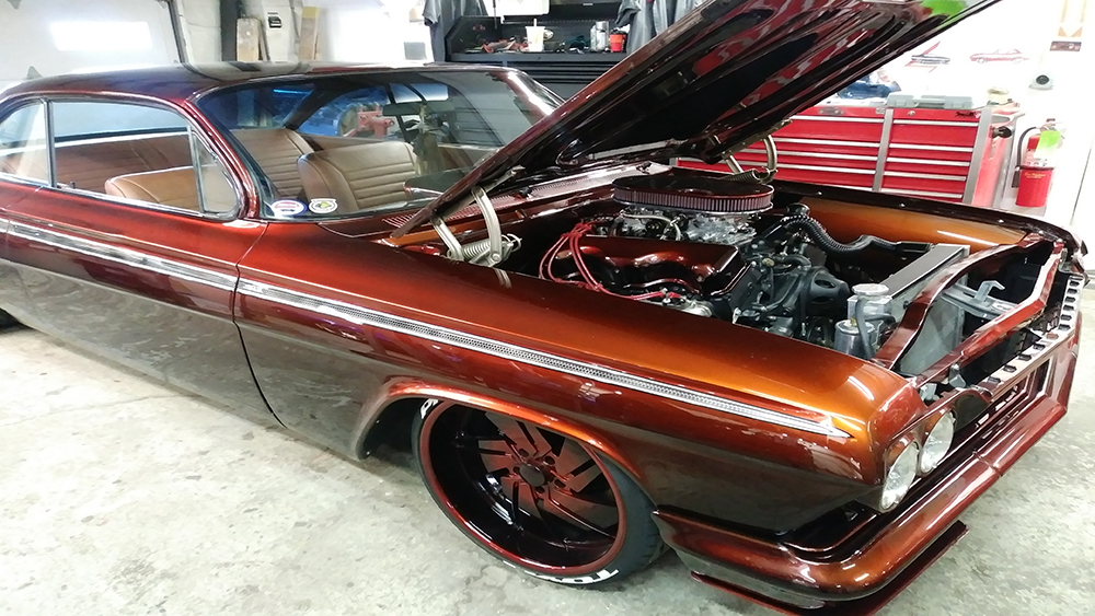 The customer wanted a fresh and updated look with a beautiful root beer color. We customized the console, narrowed the front bumper to hug the body, installed custom door handles, and custom fabricated the tops of the quarters and trunk. We removed all of the chrome and painted the grille, bumpers and custom U.S. Mags Phantom wheels. The paint is a custom blend House of Kolor Kandy tint with a unique chrome-effect graphic.
