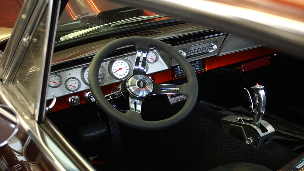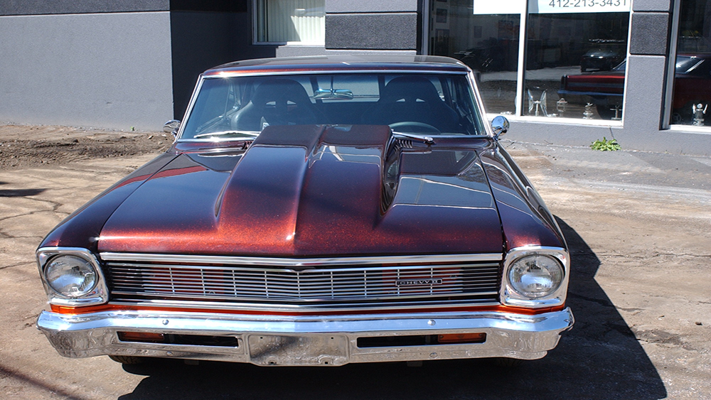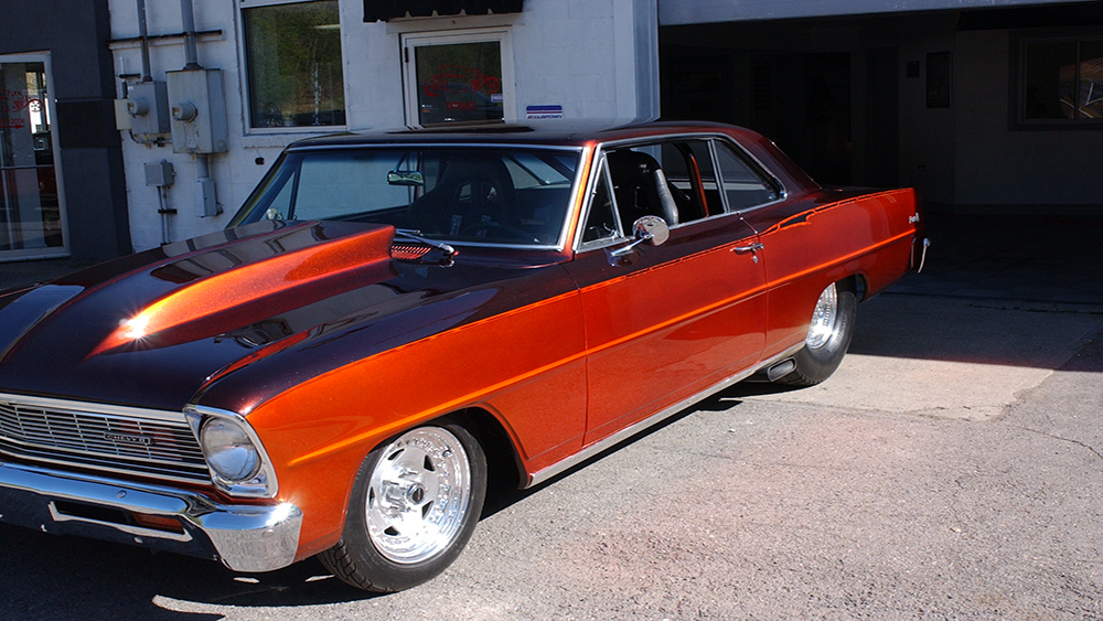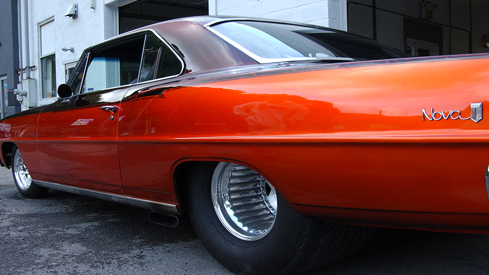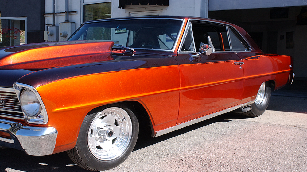 This Nova is fast enough to sneak up on you - except the engine has such a muscular sound there is no catching you off guard. The paint is a custom House of Kolor Tangerine Kandy with different underbases to produce the two-tone effect of tangerine and root beer.