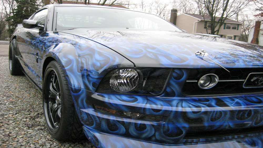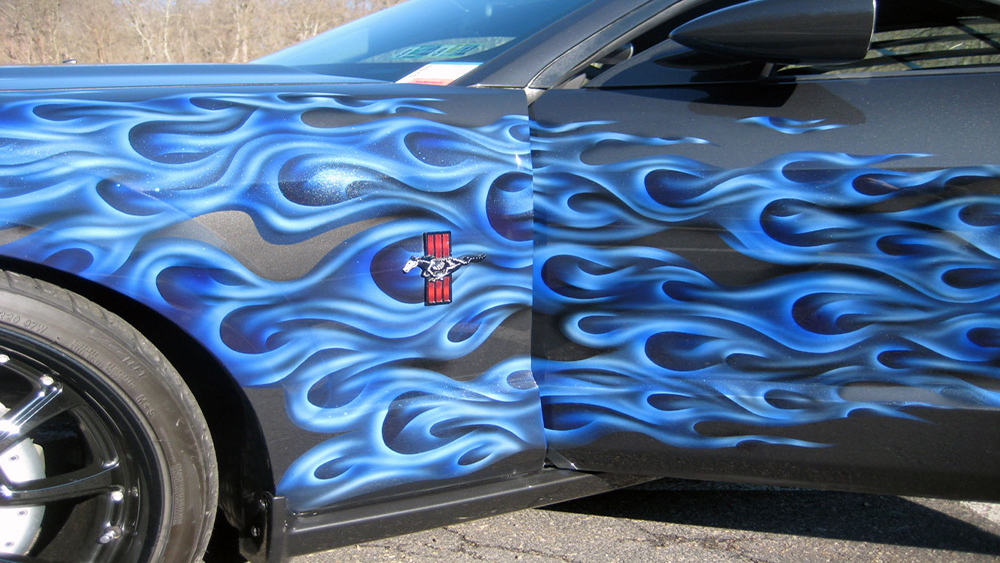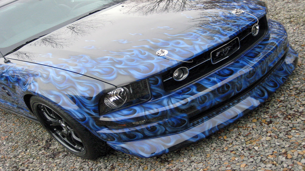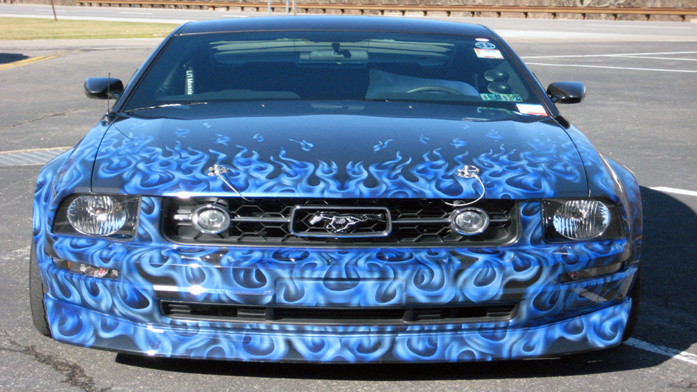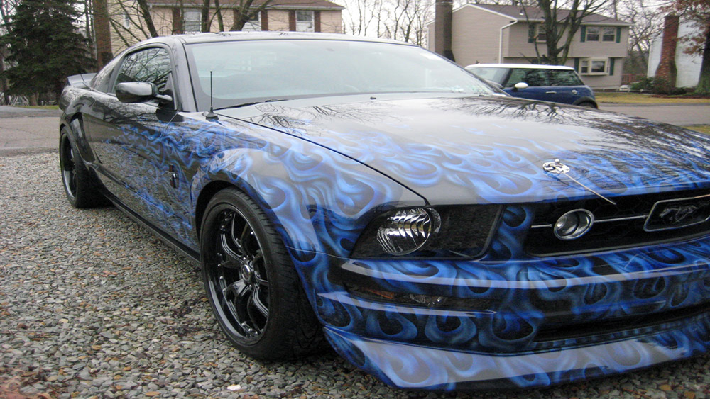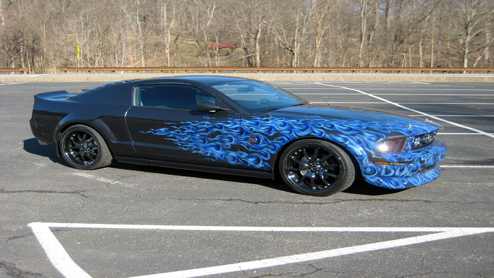 Full custom paint job, airburshed blue flames, airbrushed skeleton ponies, shaved door handles, filled in gas door, relocated gas filler door behind tail light and removed rear side windows.