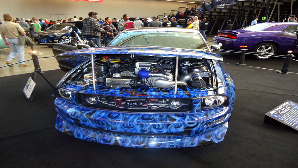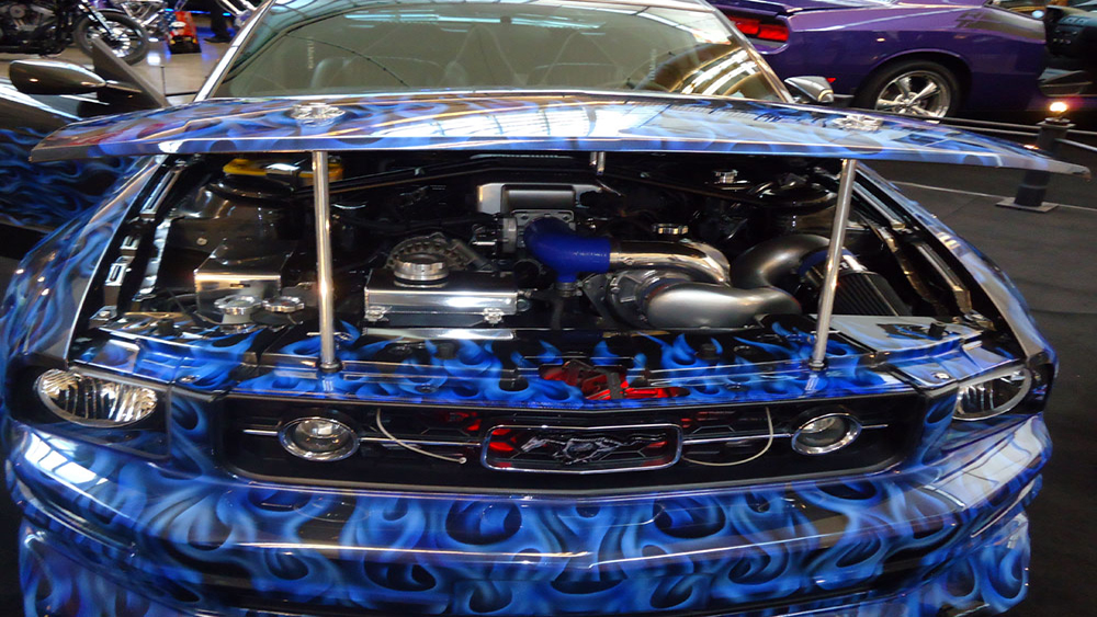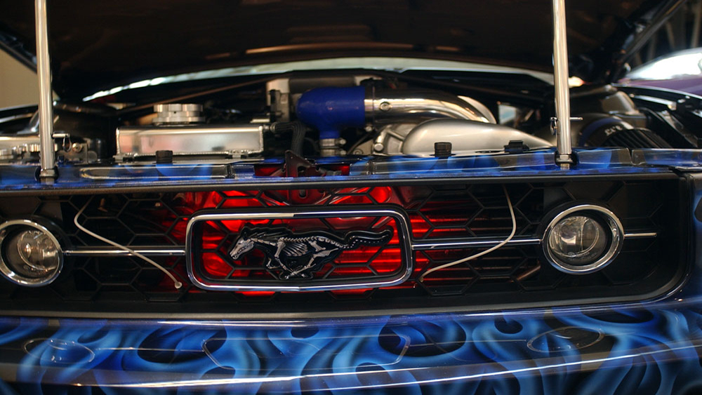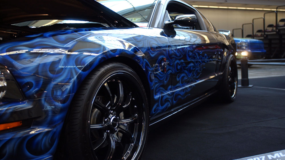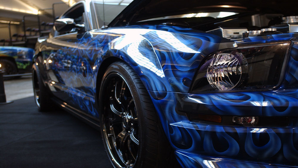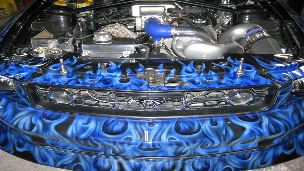 Full custom paint job, airburshed blue flames, airbrushed skeleton ponies, shaved door handles, filled in gas door, relocated gas filler door behind tail light and removed rear side windows.