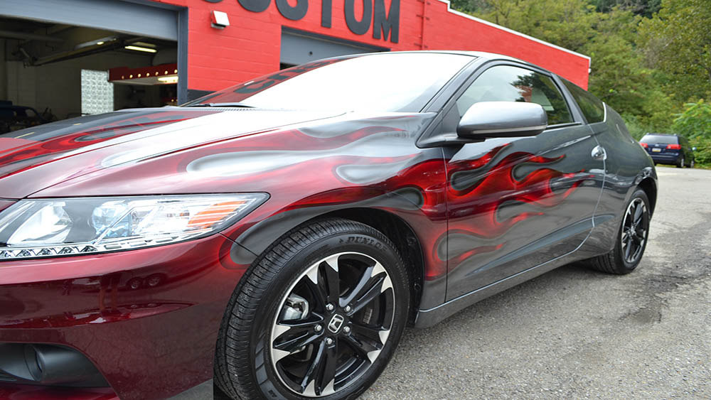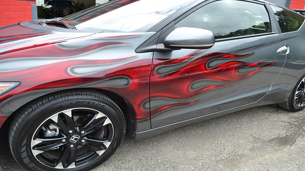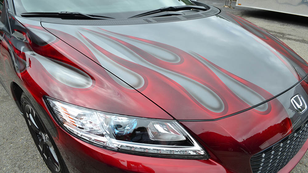 The customer wanted to jazz up his CR-Z with a fun paint job and fun he received! His car color is a “polished metal metallic” and Bruce painted his signature flames in Brandywine Kandy across the hood and body.